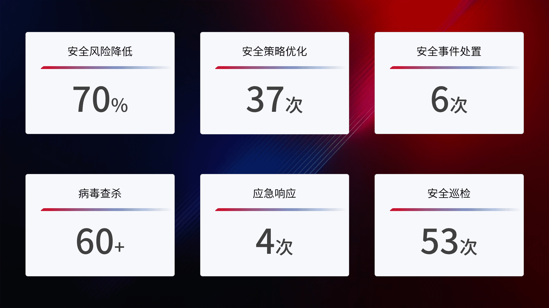 提供全面的安全事件报告体系,,,,包括处置报告、、周报、、、季度和年度总结,,,结合持续监控,,,帮助客户深入了解网络安全状况。。。